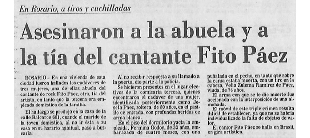 Fito estaba en Rio de Janeiro, en la habitación del hotel en medio de una gira, cuando le llega la noticia más espantosa que alguien puede recibir estando lejos. En su casa de Rosario, sus madres de crianza aparecían salvajemente asesinadas junto a la empleada. Horrible todo.
