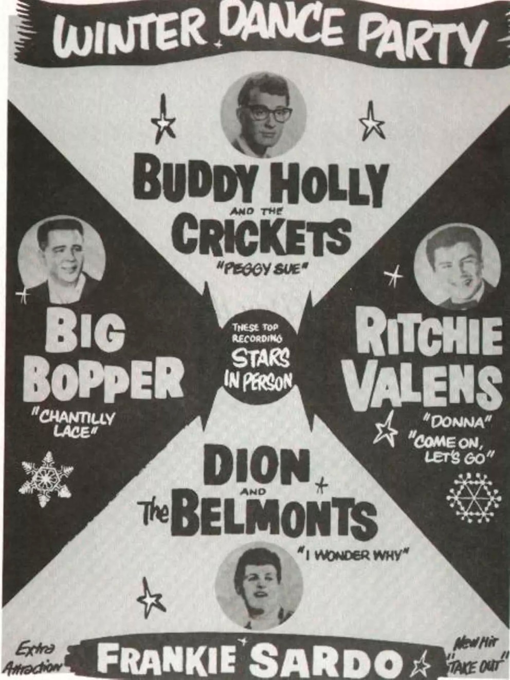 Los tres que subieron a la avioneta eran muy jóvenes aunque ya figuras consagradas. Charles Hardin Holley -Buddy Holly- tenía 22 años y brillaba en el mundo del rock’n’roll desde dos años antes, cuando en 1957 su disco simple That’ll be the day trepó al número uno en los Estados Unidos y Gran Bretaña. Otro de sus temas, Peggy Sue, también era un gran éxito que había llegado al puesto tres en su país y al seis en Inglaterra. Sin embargo, esos éxitos no se traducían en dinero y Buddy, recién casado y con un hijo en camino, tuvo que dejar la carrera como solista que había empezado en 1958 para unirse a la gira “Winter dance party” y juntar con ella un puñado de dólares. La banda estaba conformada por Waylon Jennings en el bajo, Tommy Allsup en la guitarra y Carl Bunch en la batería, a los que se unieron Valens y The Big Bopper y otros músicos. Ritchie Valens, con apenas 17 años, ya era reconocido como un pionero del rock and roll en español gracias a su éxito con “La Bamba” y The Big Booper, a los 28, venía de lograr el puesto número tres en el ranking estadounidense con su canción Chantilly Lace.