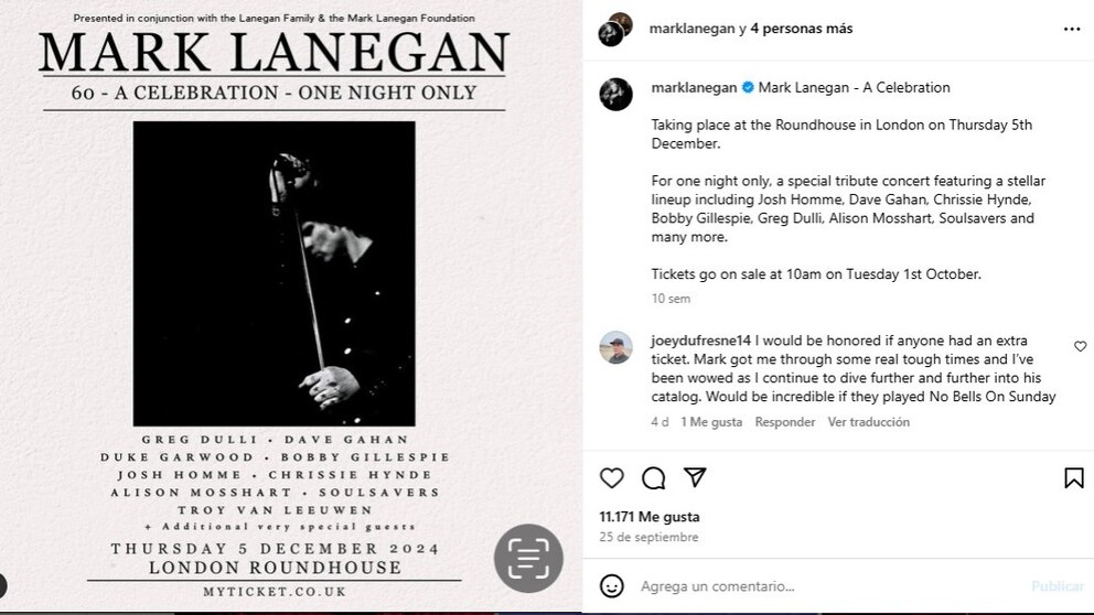 El vocalista será parte del homenaje a Mark Lanegan que se llevará a cabo en l Roundhouse de Londres