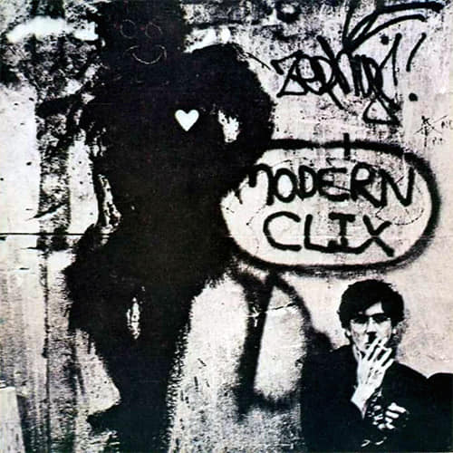 La tapa la hice junto a Uberto Sagramoso. Al disco yo lo iba a llamar Nuevos trapos, pero en una calle había una figura como la que pintaban acá de los desaparecidos, pero en negro, y decía MODERN CLIX y me pareció un muy buen nombre. En realidad era un grupo de ahí. La nave despegó.