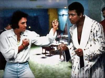 02 de febrero de 1973, Elvis Presley conoce al boxeador Muhammed Ali en Las Vegas, regalandole una bata estampada con las palabras «Campeón del Pueblo». Ali responde dándole unos guantes de boxeo con la inscripción «Eres el mejor» (izquierda) y «Para Elvis, mi mejor amigo, de Muhammad Ali» (derecha).===>#ELSIESTERO, Historias y anécdotas de las mejores Bandas del Mundo, Domingos de 17.00 hs. a 18.30 hs. 105.1FM www.fmsos.com.ar