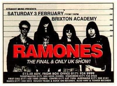 03 de febrero de 1996, The Ramones afirmaron haber tocado su último concierto en el Reino Unido, en The Brixton Academy, luego de 22 años juntos.===>#ELSIESTERO, Historias y anécdotas de las mejores Bandas del Mundo, Domingos de 17.00 hs. a 18.30 hs. 105.1FM www.fmsos.com.ar