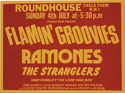 04 de julio de 1976. The Ramones debutan en el Roundhouse de Reino Unido. A partir de ese evento influencian el movimiento Punk entre el publico se contraban Sid Vicious y Joe Strummer.