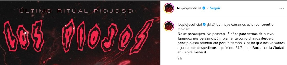 El posteo apareció pasadas las siete de la tarde y bastaron unas pocas líneas para desatar una nueva revolución piojosa. En la cuenta oficial de Los Piojos, el mensaje fue claro y emotivo: “El 24 de mayo cerramos este reencuentro Piojoso. No se preocupen. No pasarán 15 años para vernos de nuevo. Tampoco nos peleamos. Simplemente como dijimos desde un principio esta reunión era por un tiempo. Y hasta que nos volvamos a juntar, nos despedimos el próximo 24/5 en el Parque de la Ciudad en Capital Federal”. Debajo, un cartel oscuro, eléctrico, con una figura de infinito y el nombre del lugar como un grito: Parque de la Ciudad.